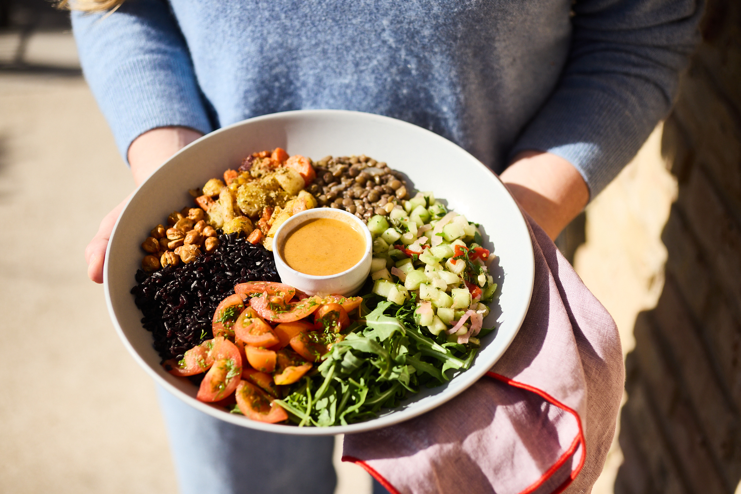Wild Arugula, Black Forbidden Rice, Za'atar Roasted Carrots, French Green Lentils, Cherry Tomato with Dill, Cucumber Salad, Crispy Chickpeas, Spicy Chili Pequin Sauce, Za'atar Sprinkle